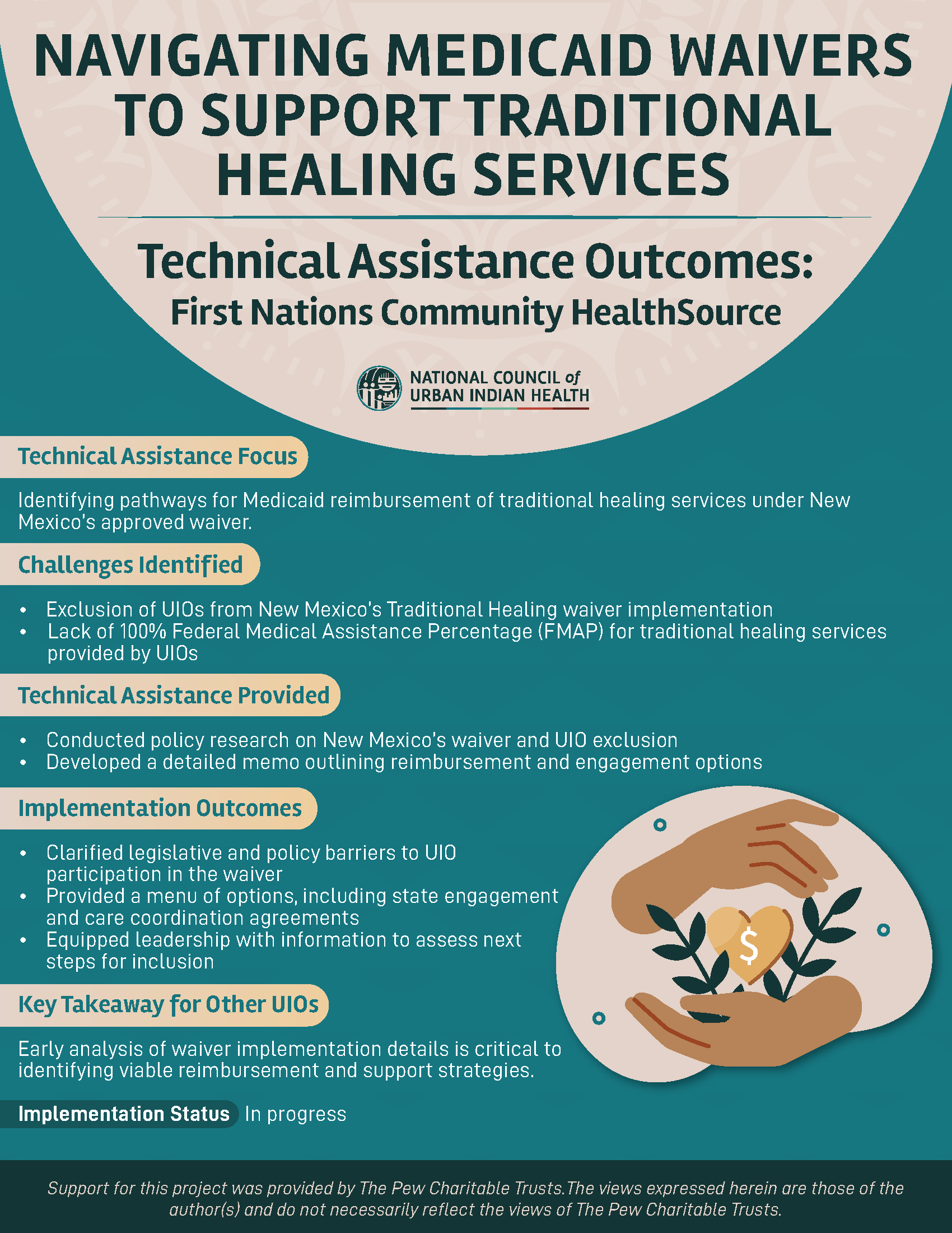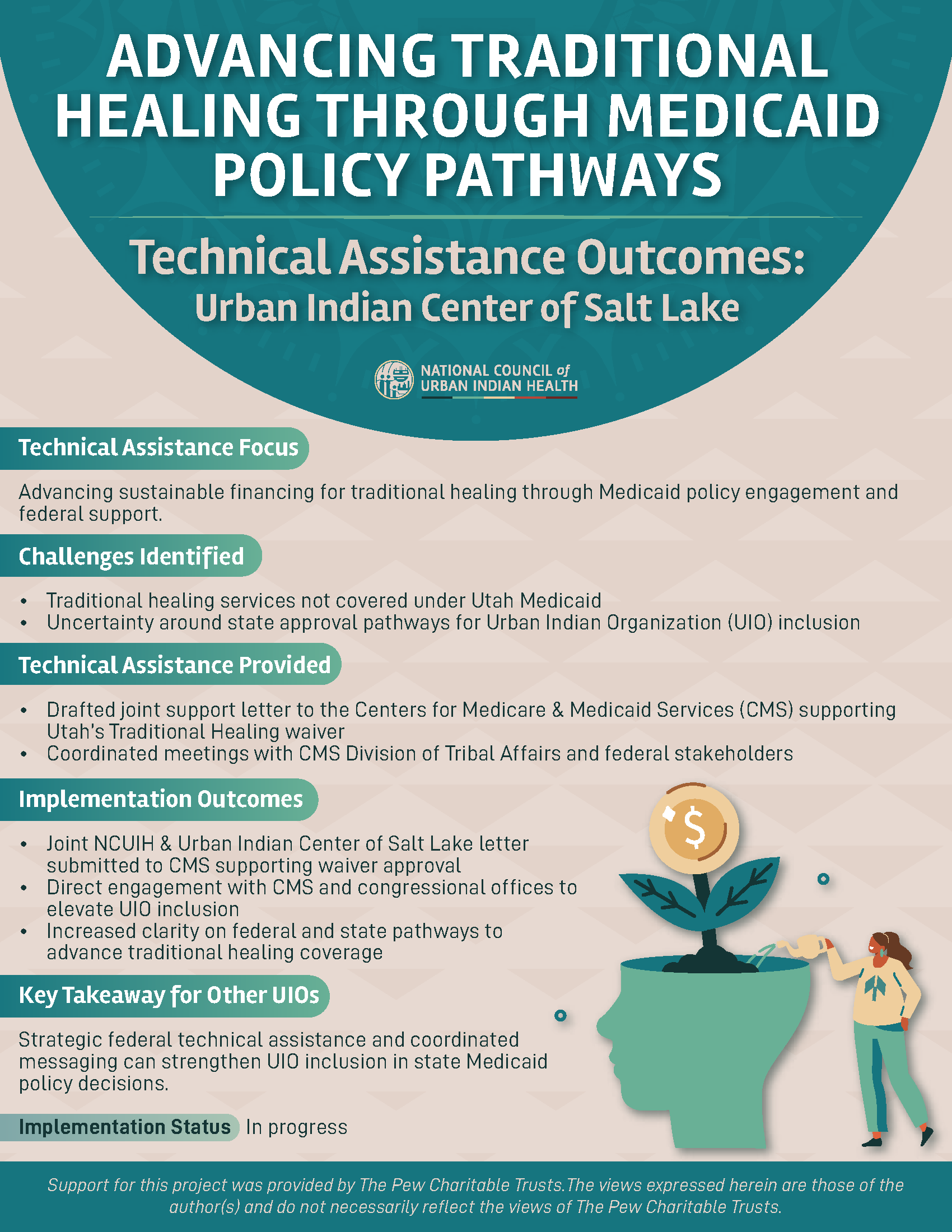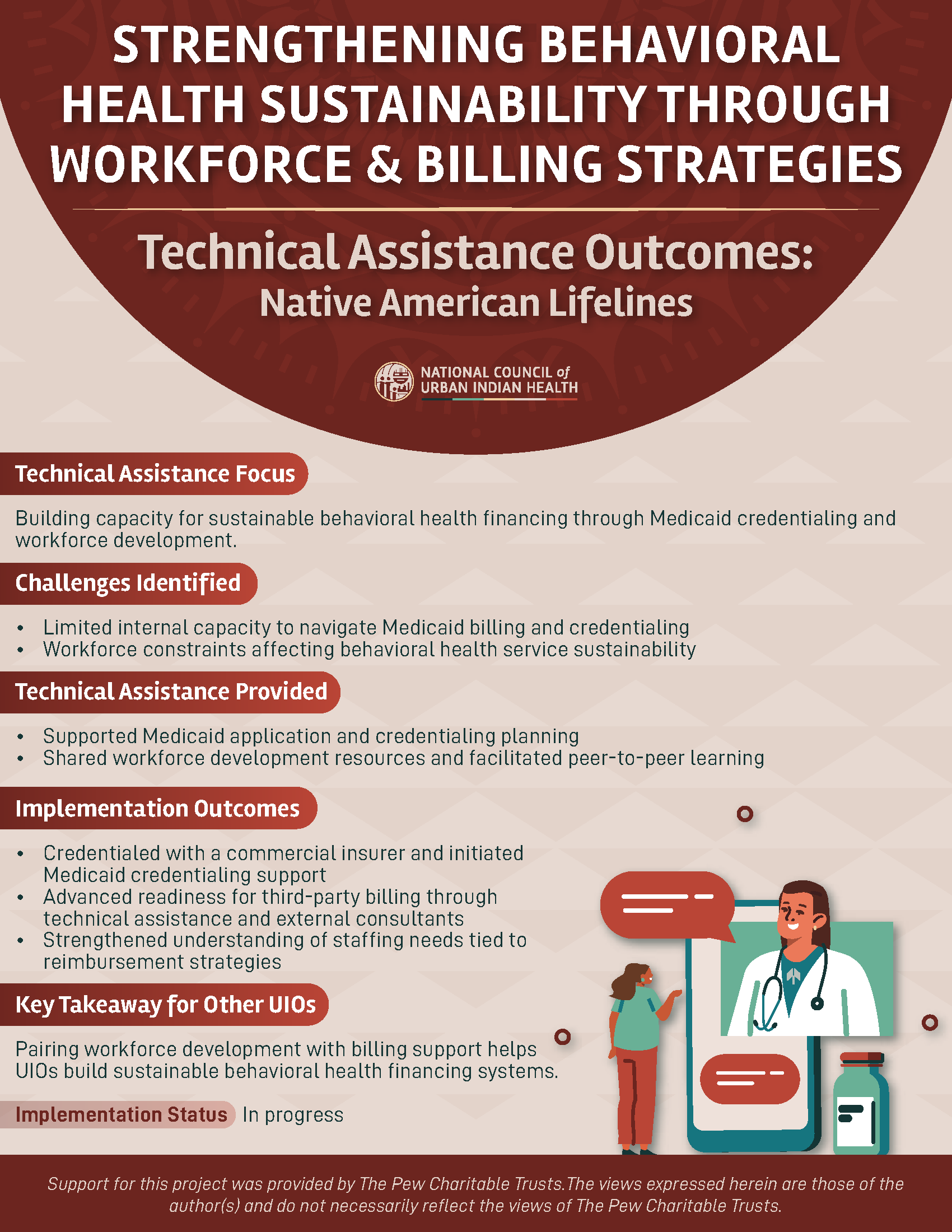 Through the Behavioral Health Technical Assistance project, supported by the Pew Charitable Trusts and Bloomberg Philanthropies, NCUIH provided individualized support to Urban Indian Organizations (UIOs) working to advance sustainable behavioral health financing. The one-pagers below highlight each UIO’s TA focus, the challenges they faced, the support NCUIH provided, and key implementation outcomes. These resources are designed to help other UIOs learn from peer experiences and identify strategies applicable to their own organizations.